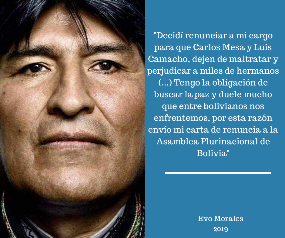 Este mismo día, en alocución televisiva, Evo Morales anunció su dimisión tras la oleada violenta perpetrada por grupos opositores desde el 20 de octubre. "Decidí renunciar a mi cargo para que Carlos Mesa y Luis Camacho, dejen de maltratar y perjudicar a miles de hermanos (...) Tengo la obligación de buscar la paz y duele mucho que entre bolivianos nos enfrentemos, por esta razón envío mi carta de renuncia a la Asamblea Plurinacional de Bolivia", indicó el expresidente, acompañado de su vicepresidente Álvaro García Linera, quien también dejó el cargo.