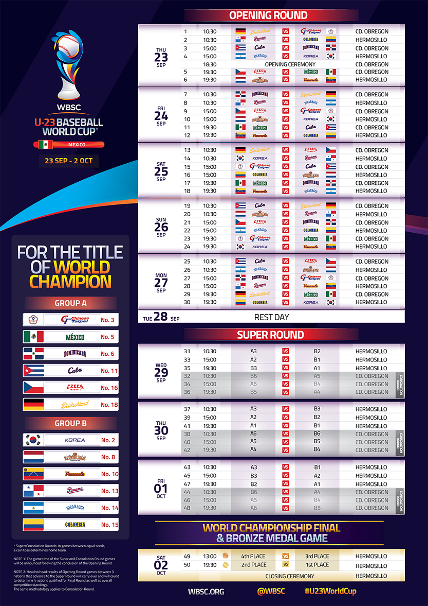 El mismo día inaugural se enfrentan a República Dominicana, sexto en 2018; el 24 van nada más y nada menos que contra México, anfitrión, rey vigente y quinto en 2016; un día después el adversario será Taipéi de China (séptimo en 2016 y quinto dos años después).