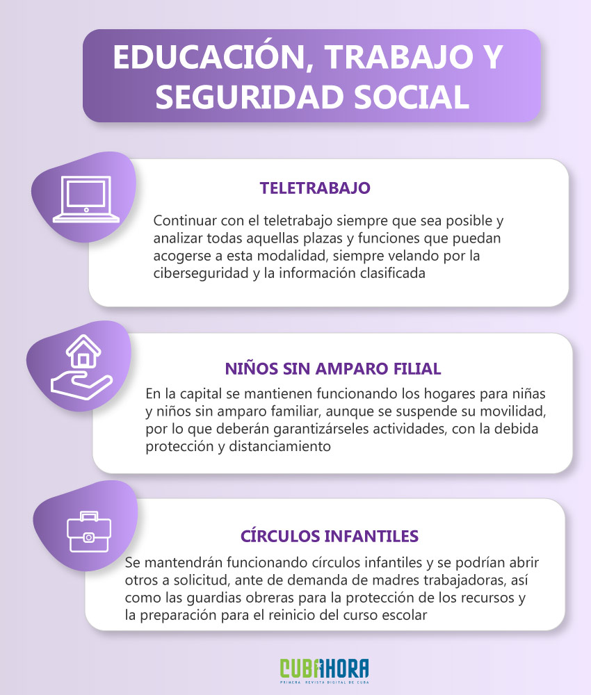 En el área de la educación, se mantendrán funcionando los hogares para niños y niñas sin amparo familiar y los círculos infantiles permanecerán abiertos. Así mismo, en el orden del trabajo y la seguridad social se hace un llamado a continuar potenciando el teletrabajo y retomar las medidas asociadas al grupo de personas mayores de 65 años.