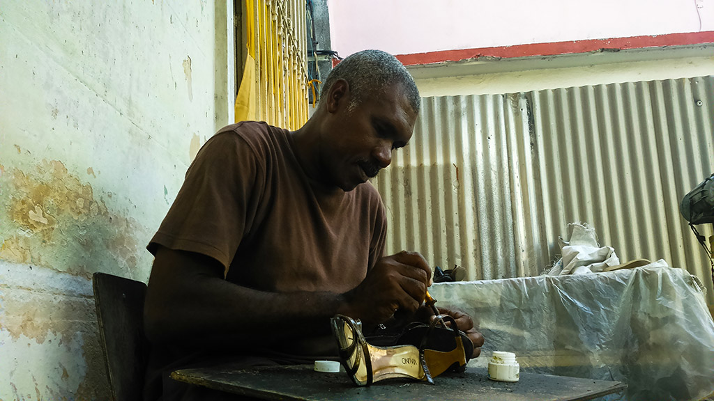 Luego de continuar nuestra búsqueda, casi por casualidad encontramos la casa de Félix Herrera Kindelán, un cuentapropista con licencia de zapatero que no detuvo nunca su trabajo mientras conversaba con nosotros. En sus manos era posible advertir la destreza que quizás no posean sus palabras, pero el orgullo con el que este hombre sencillo y amable habla de su oficio alcanza a suplir toda su timidez.