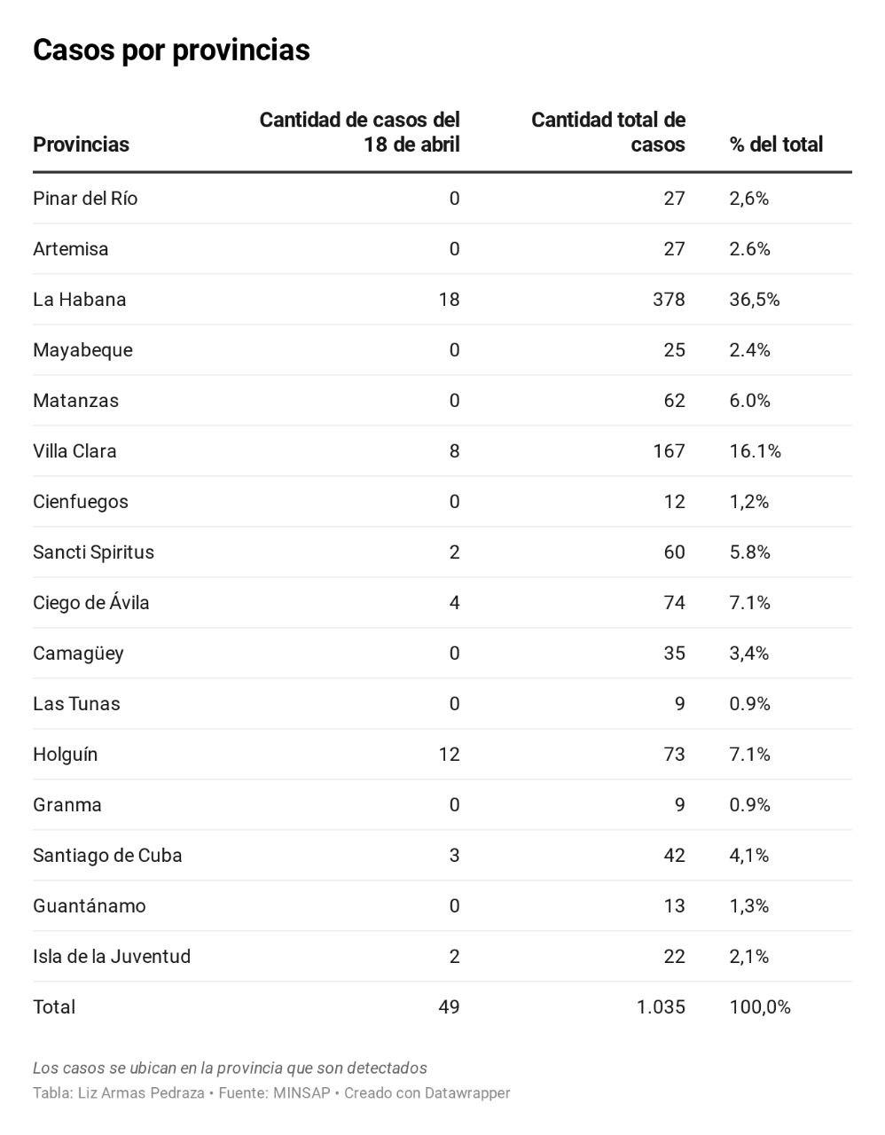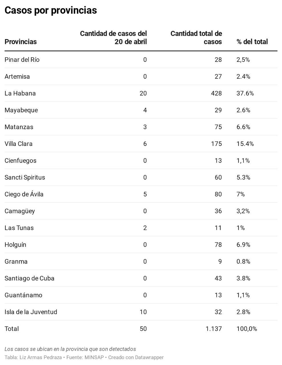 Hasta la fecha, el país acumula 1137 casos confirmados, 309 recuperados y 38 fallecidos. Mientras tanto, Isla de la Juventud, Villa Clara, y La Habana, en ese orden, reportan la mayor cantidad de casos positivos por cada 100 000 habitantes.