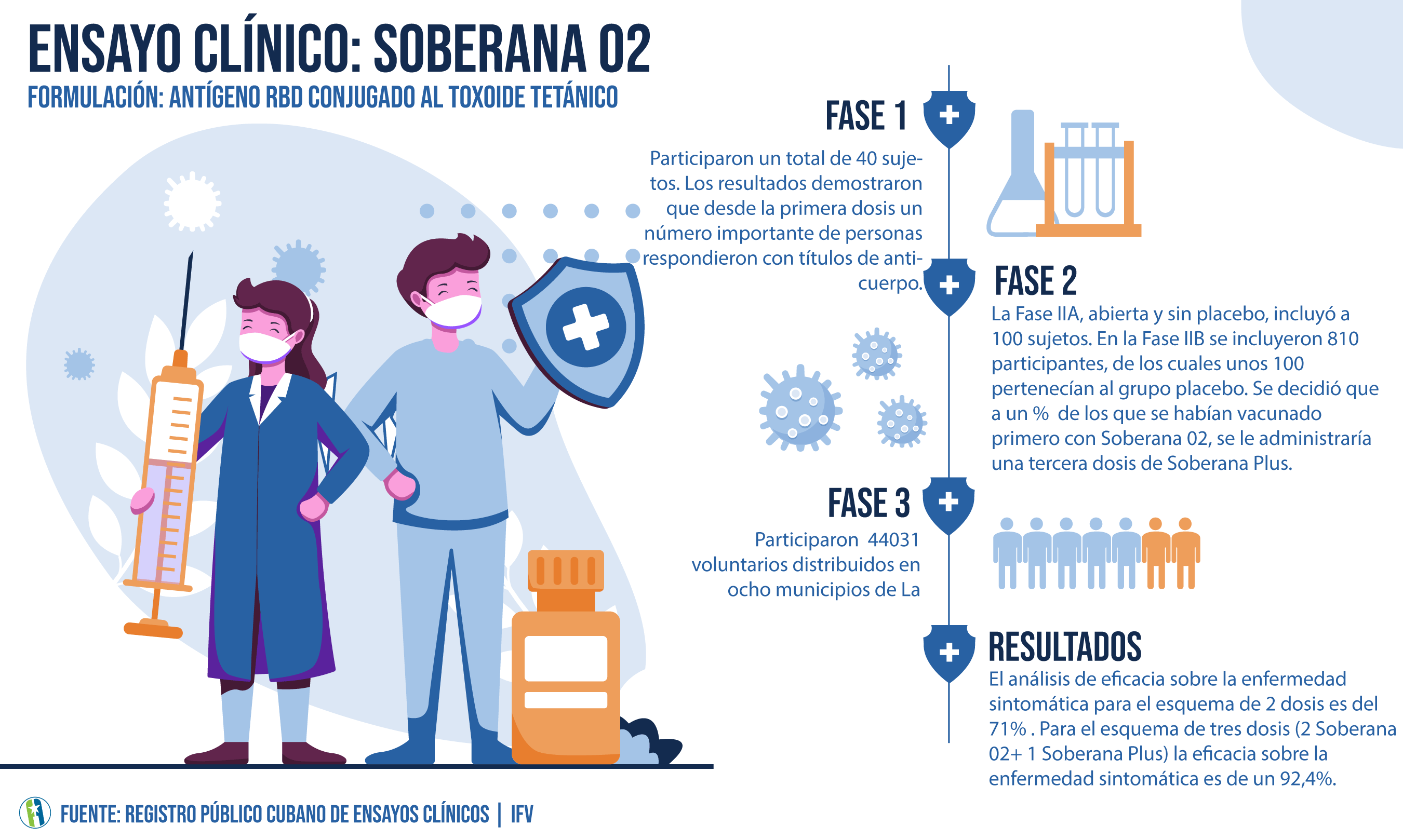 En la Fase I participaron un total de 40 sujetos. Los resultados demostraron que desde la primera dosis un número importante de personas respondieron con títulos de anticuerpo. Mientras tanto, la Fase IIA, abierta y sin placebo, incluyó a 100 sujetos y concluyó con muy buenos resultados, donde se confirmó que dos dosis de Soberana 02 y una de Soberana Plus era la mejor fórmula para el candidato vacunal Soberana 02.