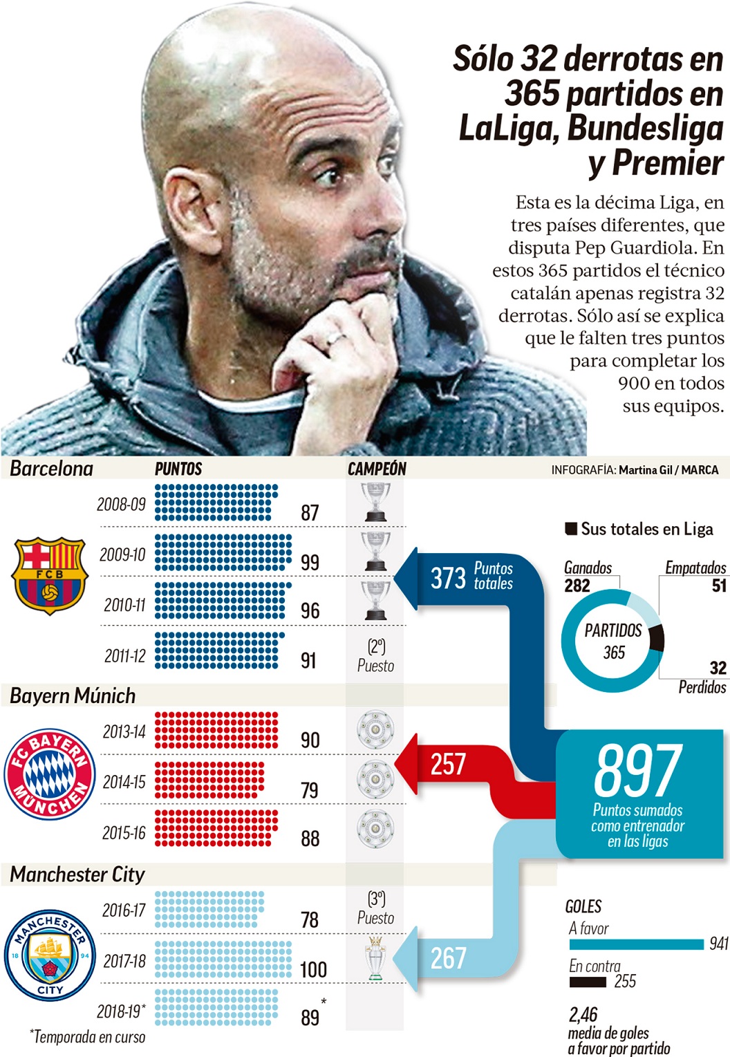 Tres años después quiso probar en el football inglés y la historia se repitió. Luego de poco más de 600 millones de euros, Pep acumula en la Premier similar palmarés que Roberto Mancini o Manuel Pellegrini y conserva la misma mala suerte fuera de casa.