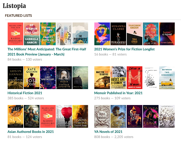Otra opción si nos sabes qué escoger es Listopia, sección que recoge listas de libros agrupadas según los más disímiles criterios. Así que, por ejemplo, si prefieres la ciencia ficción, puedes ir allí y buscar una lista de las mejores obras de ciencia ficción de este año según los usuarios. Las hay de casi cualquier cosa, los libros que deberían ser películas, los que deberías leer al menos una vez, los más esperados de 2021, los mejores de horror retro, por solo mencionar algunas.