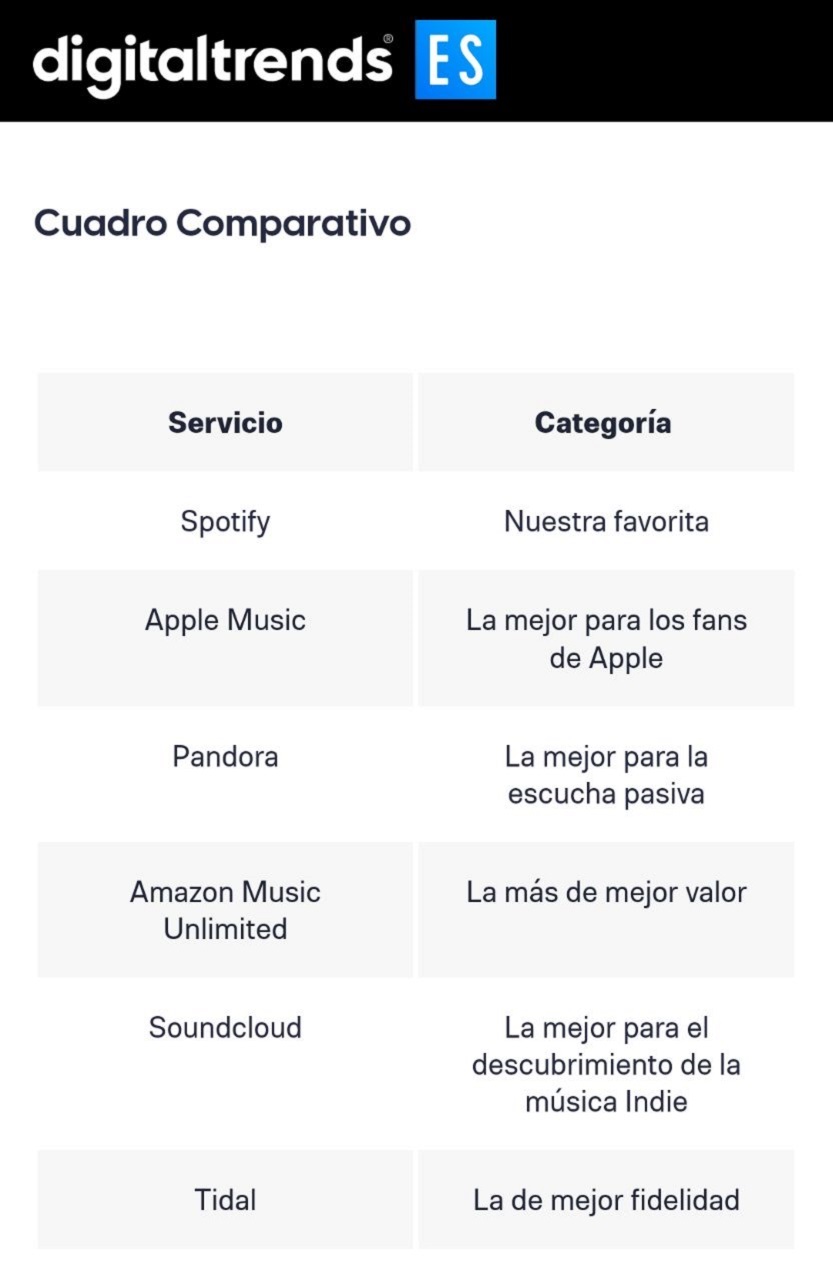 En abril de 2021 el portal español Digital Trends, especializado en tecnología, situaba a Spotify como la mejor plataforma de música en streaming. En el listado entraban también Apple Music, Pandora, Amazon Music Unlimited, Soundcloud y Tidal.