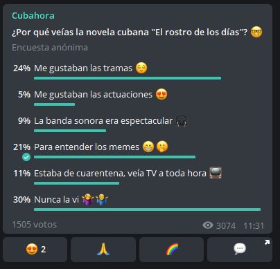 Aun cuando el programa tanteó temas de alto impacto en el entramado social cubano, como la maternidad y paternidad, la familia, VIH/SIDA, abuso sexual, embarazo adolescente, desde nuestro Canal de Telegram nos atrevimos a preguntar a esa otra audiencia por qué veían la telenovela cubana. De un total de 1505 votos, un 30% aseguró que nunca la vio, otro 24% porque le gustaba la trama y un 21% para entender los memes, un fenómeno que si bien es común en el escenario digital actual, en las noches de transmisión de la novela fue “especial”.
