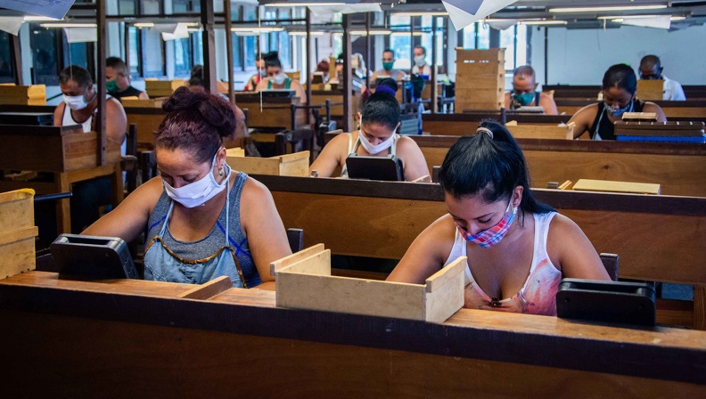 A pesar de las incidencias de la COVID- 19 se trabaja bajo estrictas medidas higiénico- sanitarias para garantizar productos exportables. Un emjemplo de ello es el torcido del tabaco, el cual mantiene un ritmo sostenido en la fábrica Juan Casanueva del municipio Consolación del Sur, de la Occidental provincia de Pinar del Río (Foto: Rafael Fernández Rosell/ ACN)