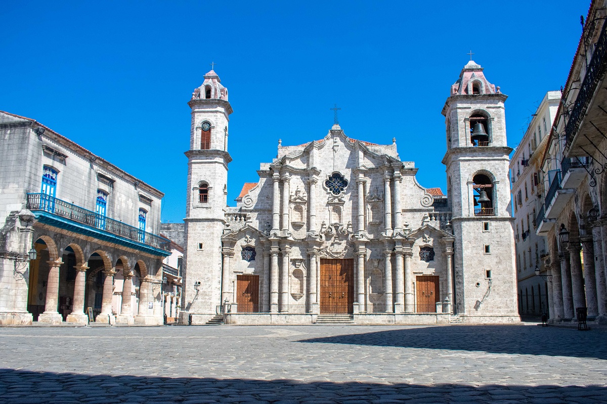 Dadas las medidas de aislamiento social se pueden ver vacíos lugares públicos emblemáticos como la plaza de la Catedral de La Habana (Foto: Alejandro Leonardo Benítez Guerra)