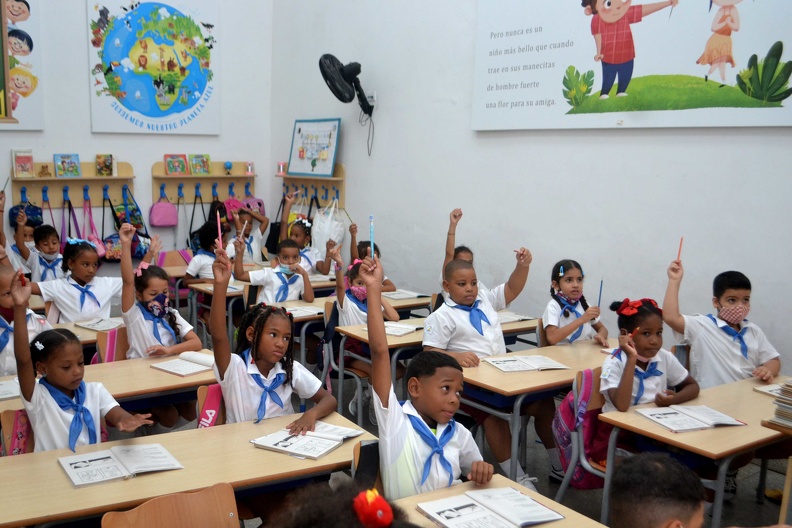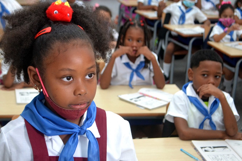 Estudiantes que reanudan el curso escolar 2021-2022, en la escuela primaria Rafael María de Mendive, en el municipio Habana Vieja. (Yury Díaz Caballero/ACN)