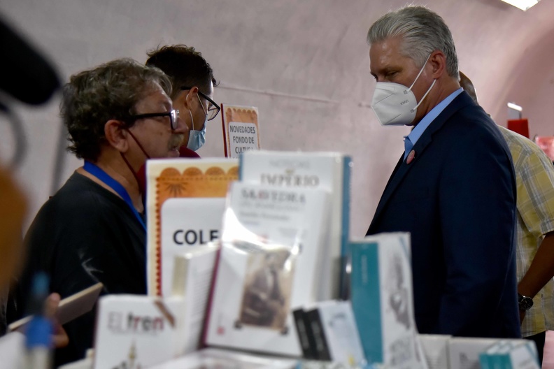 Miguel Díaz-Canel Bermúdez (D), primer secretario del Comité Central del Partido Comunista de Cuba y presidente de la República, recorre junto al mexicano Paco Ignacio Taibo II (I), escritor y director del Fondo de Cultura Económica (FCE), el pabellón central de la XXX edición de la Feria Internacional del Libro de La Habana 2022, en la Sala Nicolás Guillén de la Fortaleza San Carlos de la Cabaña, el 20 de abril de 2022. ACN FOTO/Omara GARCÍA MEDEROS
