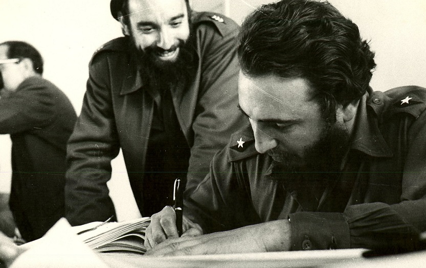 Núñez junto a Fidel en el INRA, desde donde se adoptaban importantes decisiones para transformar la realidad plasmada en su libro Geografía de Cuba (Foto: Cortesía del autor).