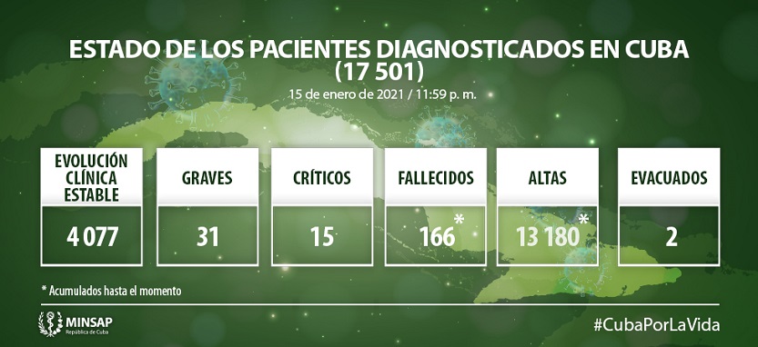 De los 17 mil 501 pacientes diagnosticados con la enfermedad, se mantienen ingresados 4 mil 123 (23,5%), 4 mil 077 (99,29%) con evolución clínica estable. Se reportan fallecidos 166 (cuatro en el día), dos evacuados, 30 retornados a sus países, 238 altas del día, se acumulan 13 mil 180 pacientes recuperados (75,3%). Se atienden en las terapias intensivas 46 pacientes confirmados, de ellos 15 críticos y 31 graves.