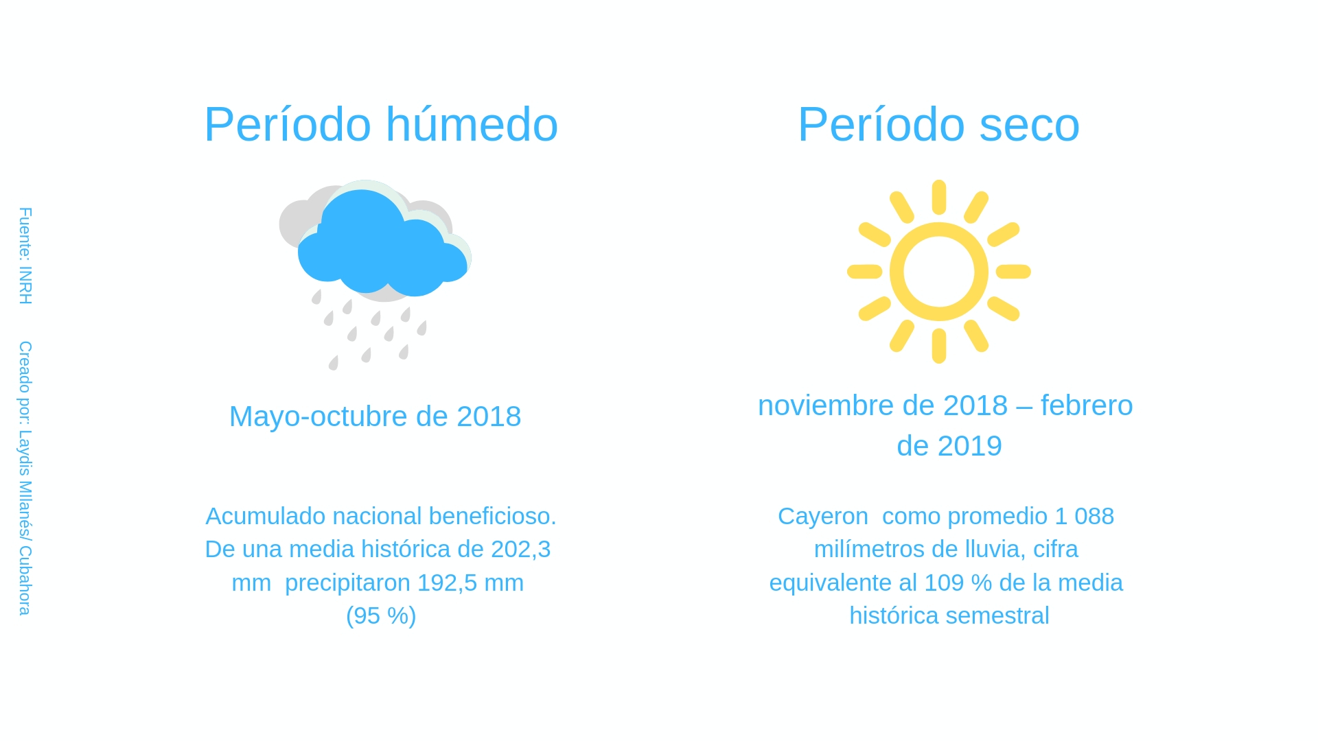 La lluvia es la única fuente de agua que existe en Cuba. Su media anual de 1 335 mm es considerada relativamente baja, por lo que los recursos hídricos son limitados. Sin embargo, en los últimos dos años se ha superado la media anual, lo que ha sido favorable para el país.