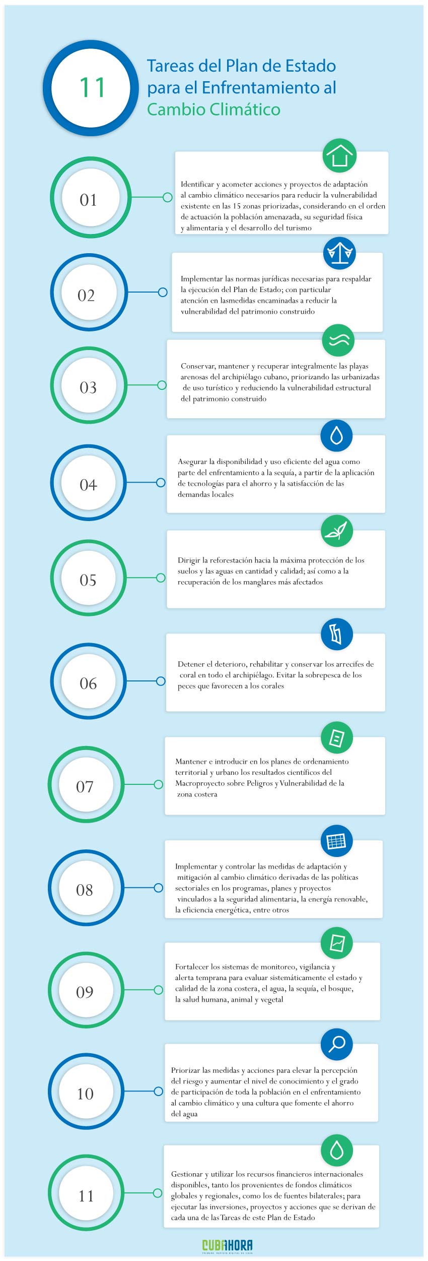 La Tarea Vida contiene 11 tareas, entre las cuales figuran asegurar la disponibilidad y el uso eficiente del agua como parte del enfrentamiento a la sequía; dirigir la reforestación hacia la máxima protección de los suelos y las aguas; detener el deterioro de los arrecifes de coral, rehabilitarlos y conservarlos; así como implementar otras medidas en programas, planes y proyectos vinculados a la energía renovable, la eficiencia energética, la seguridad alimentaria, la salud y el turismo.