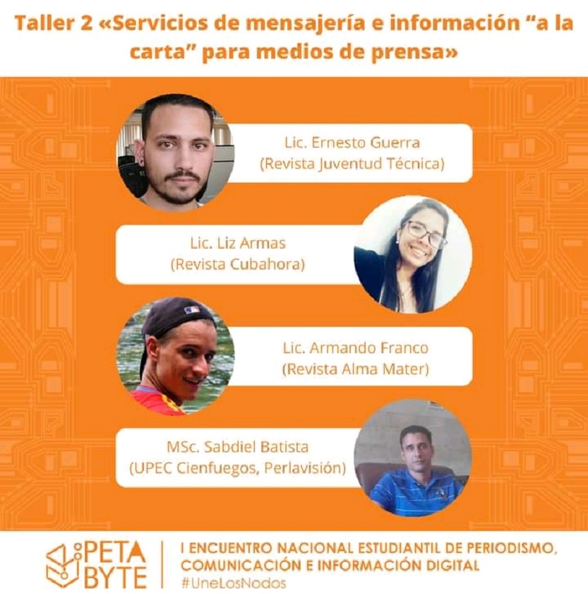 La modalidad de taller contempló los temas de producción de podcast y servicios de mensajería e información para medios de prensa, donde participaron como invitados Lic. Dailene Dovale, profesora de la Universidad de La Habana, Lic. Alejandro Rojas de la Unicef, el Lic. Edilberto Carmona, de Cubadebate.