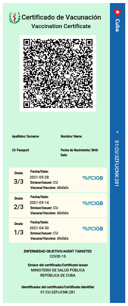 Este documento no sustituye la tarjeta oficial de vacunación (modelo 84-21-02a), constituirá una opción más para portar la certificación del esquema de vacunación en Cuba para dicha enfermedad.