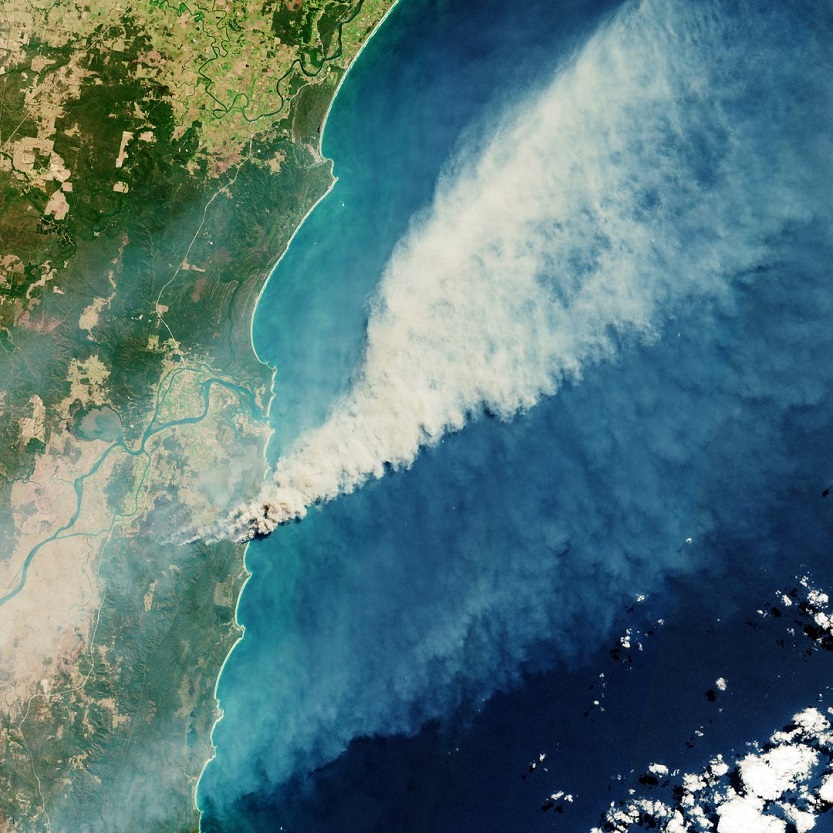 Australia tuvo que lidiar con múltiples incendios forestales en Nueva Gales del Sur y Queensland. En esta imagen capturada por la misión Copernicus Sentinel-2 el 8 de septiembre, son visibles los incendios que tuvieron lugar el Parque Nacional Yuraygir y el área de Shark Creek.