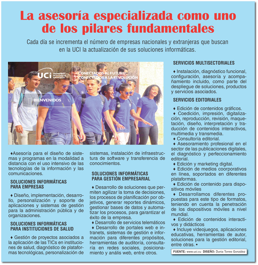 La Universidad de las Ciencias Informáticas (UCI) desde su surgimiento, en el año 2002, se distingue por sus buenas prácticas en la producción de aplicaciones y servicios informáticos que han contribuido en la calidad del trabajo en diferentes sectores de la economía, dentro y fuera de Cuba. Con solo 16 años de experiencia, su alcance va más allá de las actividades docentes. Actualmente cuenta con un catálogo comercial con productos desarrollados sobre plataformas de software libre y avalados por la certificación internacional Nivel II de CMMI (modelo de mejora del rendimiento de clase mundial para organizaciones competitivas que desean lograr operaciones de alto rendimiento).