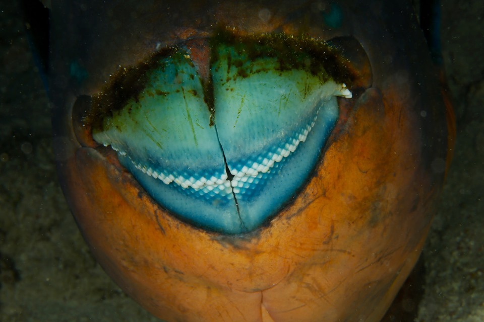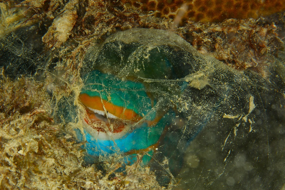 Pero algunas especies de loros, especialmente el Queen Parrotfish o Scarus vetula, se refugian dentro de una cavidad pequeña del arrecife y segregan un mucus que cubre casi todo su cuerpo, esta sustancia transparente parece que crea una barrera protectora, donde los depredadores no pueden oler su esencia, especialmente las morenas que son cazadoras nocturnas y dependen de su olfato para localizar a sus presas. Esa es la explicación al comportamiento del pez loro que mostramos en una publicación anterior.