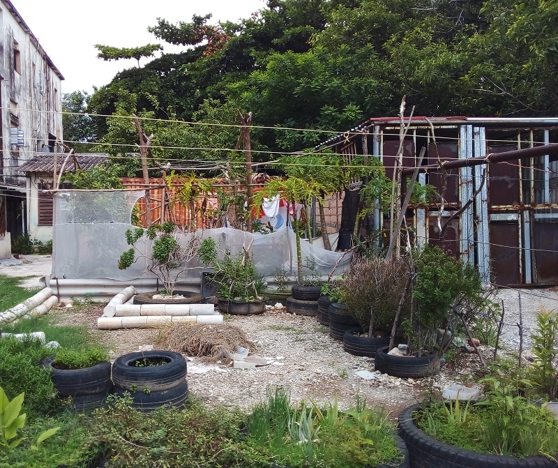 En el patio de María Victoria Pérez se reutilizan neumáticos de carros como canteros para los sembrados. (Maya Quiroga/Cubahora)