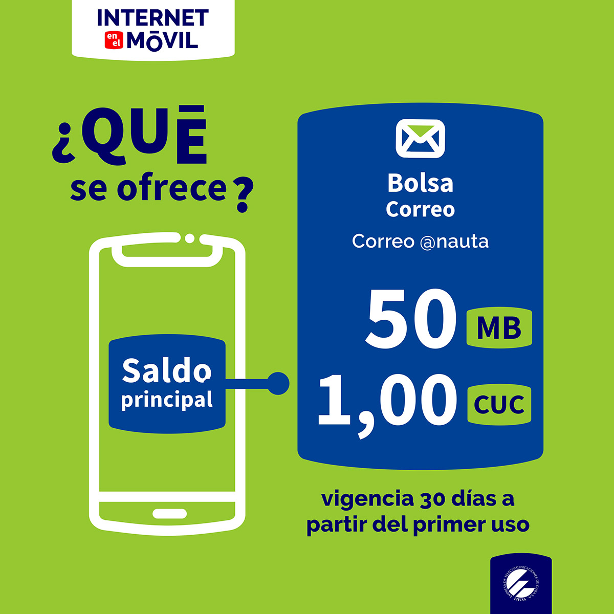 Este servicio permite a los usuarios acceder a su cuenta de correo nauta desde el móvil e incluye 50 MB de datos por el precio de 1.00 CUC, los cuales se descuentan del saldo principal. El cliente para adquirir esta bolsa debe tener como mínimo 1.00 CUC como saldo principal. Tiene 30 días de vigencia que se empiezan a descontar a partir de su primer día de uso.
