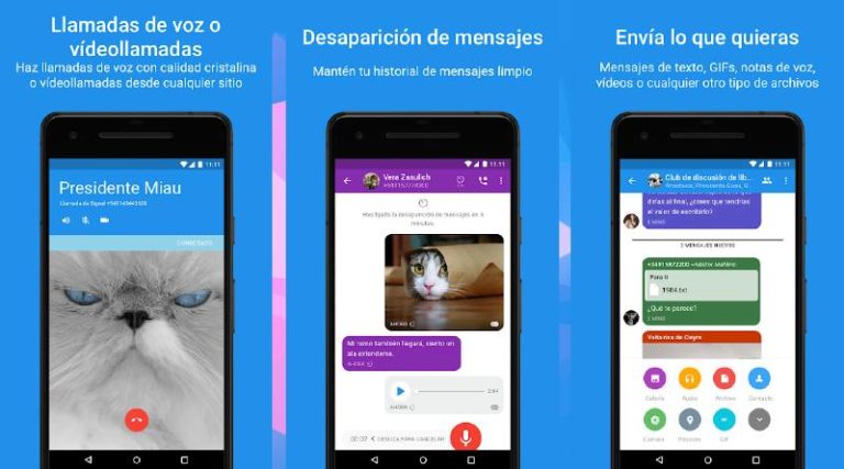 Es una aplicación gratuita que destaca por su gran seguridad ya que cuenta con un fuerte cifrado. Es sencilla de usar y, al igual que WhatsApp, permite realizar llamadas de voz y vídeo y enviar notas de voz. La aplicación también se puede usar a través del ordenador ya que cuenta su versión de escritorio. Como en WhatsApp se pueden borrar los mensajes y programar el momento en el que el usuario quiere que se eliminen.