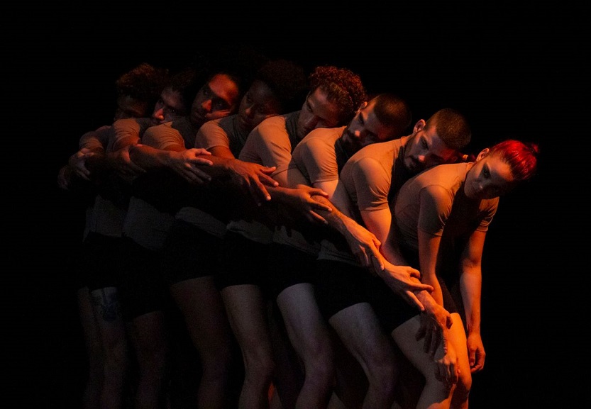 Los cuerpos miran hacia el “cielo” del escenario. Están formados, en una fila. Una fila en movimiento en la que el primer bailarín viaja por encima de sus colegas hasta llegar al final: una rotación infinita de desventuras, en la que cada uno aporta su marca individual de pesar, y en la que todos, en un bucle infinito, coinciden en los puntos cardinales del desarraigo.