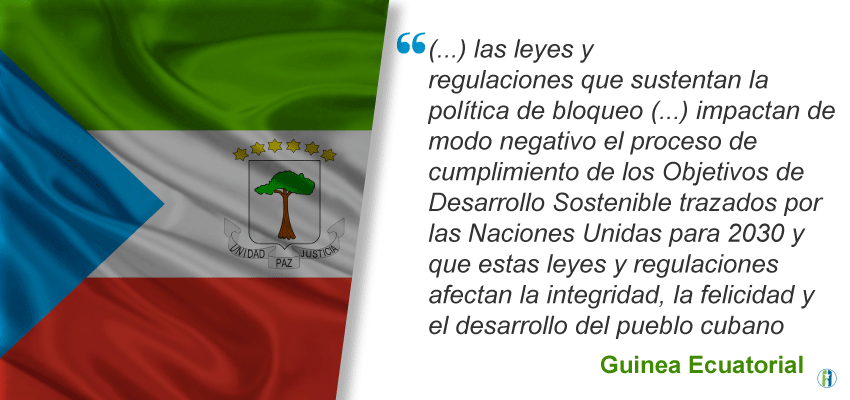 “El carácter extraterritorial de las leyes y regulaciones de la política estadounidense hacia Cuba pone en menoscabo el espíritu de paz, cooperación, solidaridad y genuina expresión de libre comercio que debe prevalecer en la comunidad internacional, como lo reafirma la aplicación efectiva de la denominada Ley Helms-Burton”, expresó Guinea Ecuatorial a la ONU.