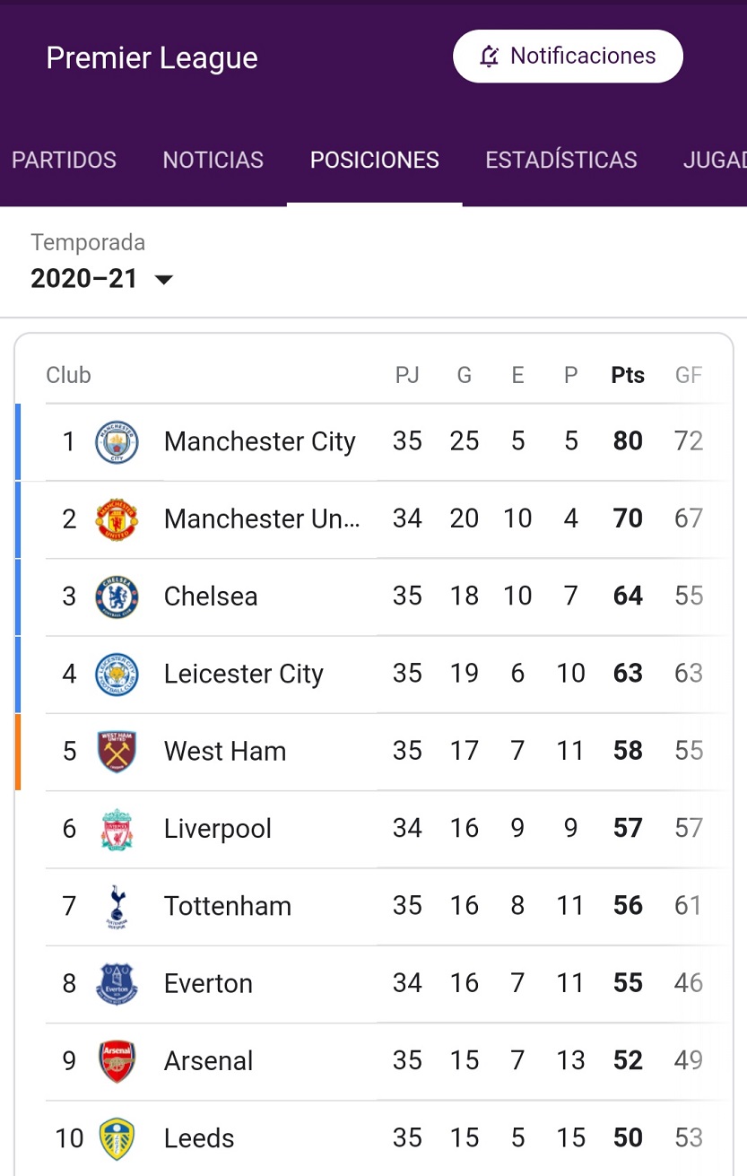 Tras este resultado, los citizens tendrán que esperar al menos una jornada más para proclamarse campeón de liga por quinta vez en la historia, pues su más cercano perseguidor, Manchester United se impuso 1-3 en su visita al Aston Villa.
