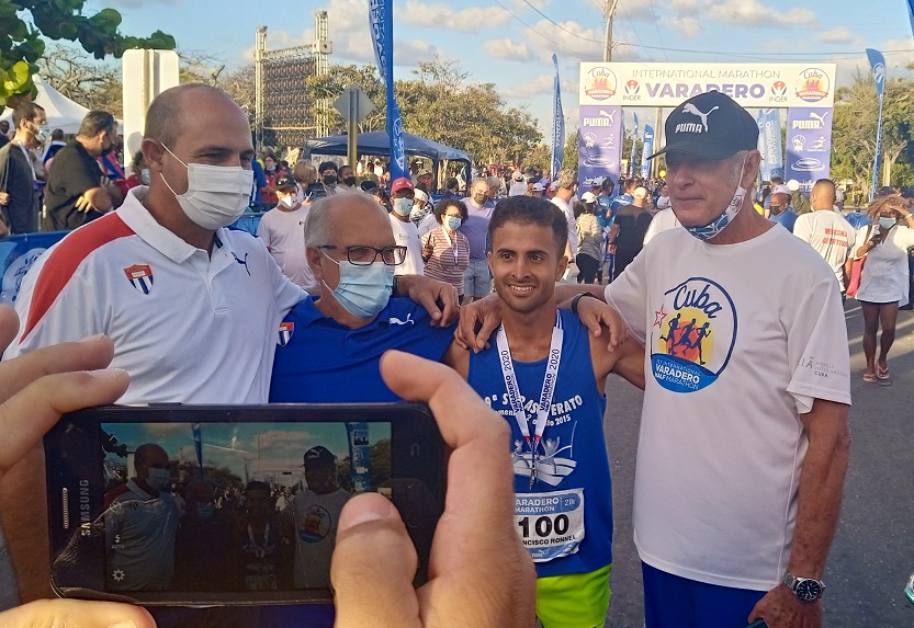 Francico Ronnie Estevez junto a Alberto Juantorena y autoridades del Inder tras ganar la media maratón. (Duanys Hernández/Cubahora)
