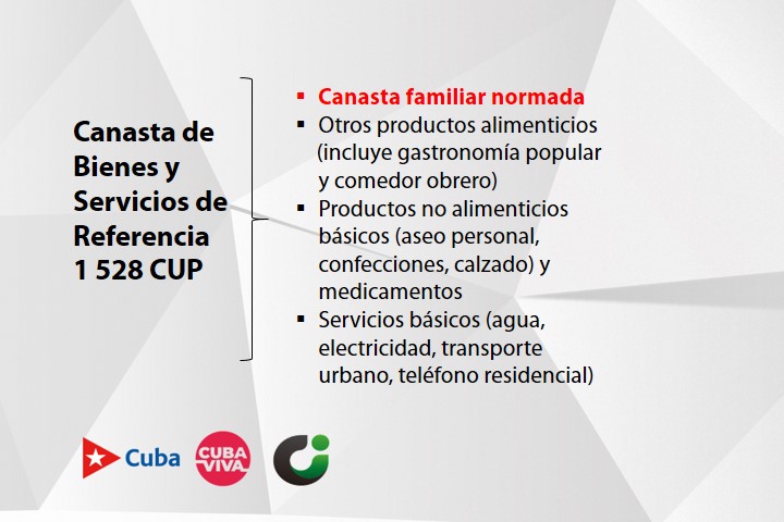Dentro de esta, se encuentra la canasta familiar normada, abarca productos alimenticios (19) y combustibles domésticos que de manera racionada se comercializan mediante la libreta de abastecimientos. Esta tiene un costo futuro de 180 pesos.