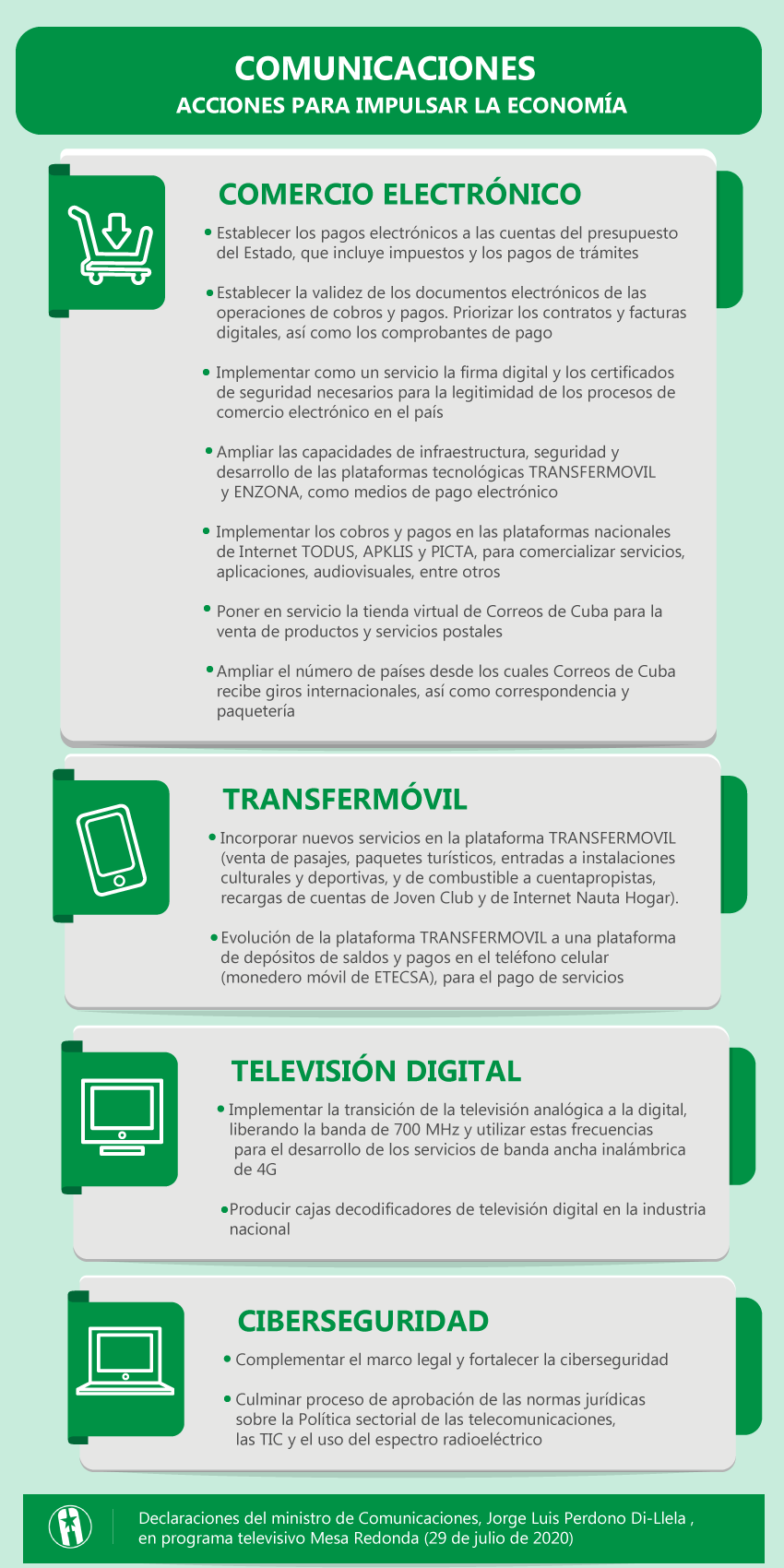 - Ampliar las capacidades de infraestructura, seguridad y desarrollo de las plataformas tecnológicas TRANSFERMOVIL y ENZONA, como medios de pago electrónico para generalizar el comercio electrónico en el país.
