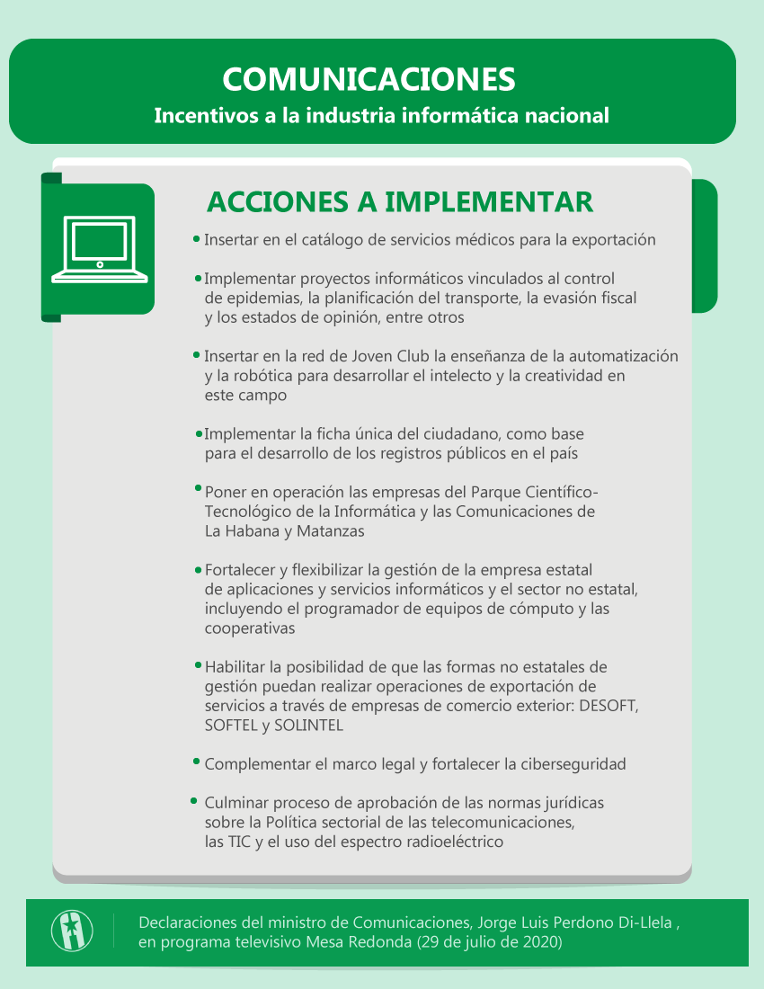 - Fortalecer y flexibilizar la gestión de la empresa estatal de aplicaciones y servicios informáticos y el sector no estatal, incluyendo el programador de equipos de cómputo y las cooperativas.