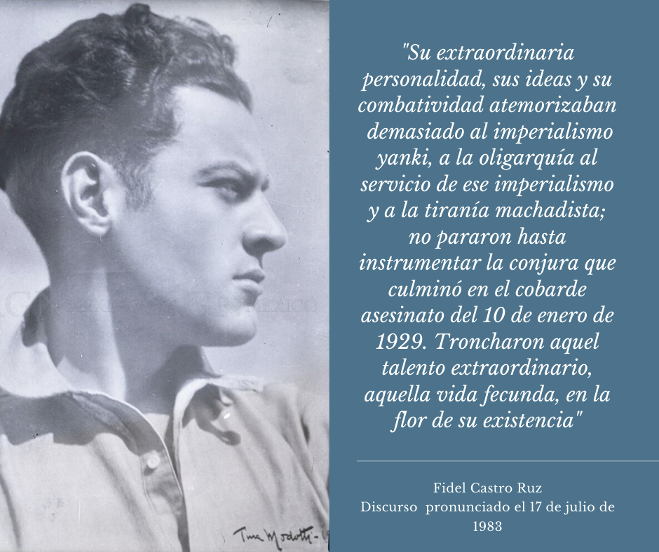 En 1929, Mella fue asesinado y Tina lo presenció. Entonces, pronunció: “En Mella asesinaron no solo al enemigo del dictador cubano, sino al enemigo de todas las dictaduras. Machado ha cometido un nuevo crimen, pero hay muertos que hacen temblar a sus asesinos, y cuya muerte representa, para aquellos, el mismo peligro como su vida de combatientes. Esta noche, un mes después del cobarde asesinato, honramos la memoria de Mella, prometiendo seguir su camino, hasta lograr la victoria de todos los explotados de la tierra. De esta manera lo recordamos como él lo hubiera preferido: no llorando sino luchando…”