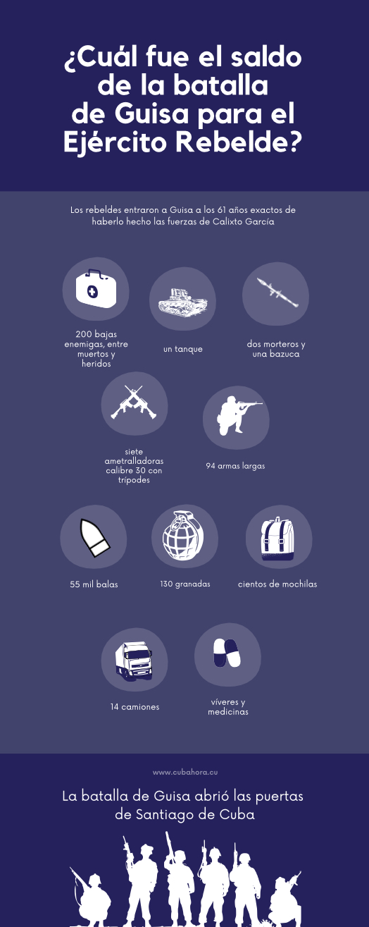 Los rebeldes entraron a Guisa a los 61 años exactos de haberlo hecho las fuerzas de Calixto García. El saldo de la batalla fue desastroso para el ejército constitucional, pues tuvo más de 200 bajas entre muertos y heridos. Según dio a conocer Radio Rebelde, sobre el terreno quedaron un tanque, dos morteros, una bazuca, siete ametralladoras calibre 30 con trípodes, 94 armas largas y 55 mil balas. Otras fuentes refieren que se capturaron, además, 130 granadas, cientos de mochilas, 14 camiones, víveres y medicinas.