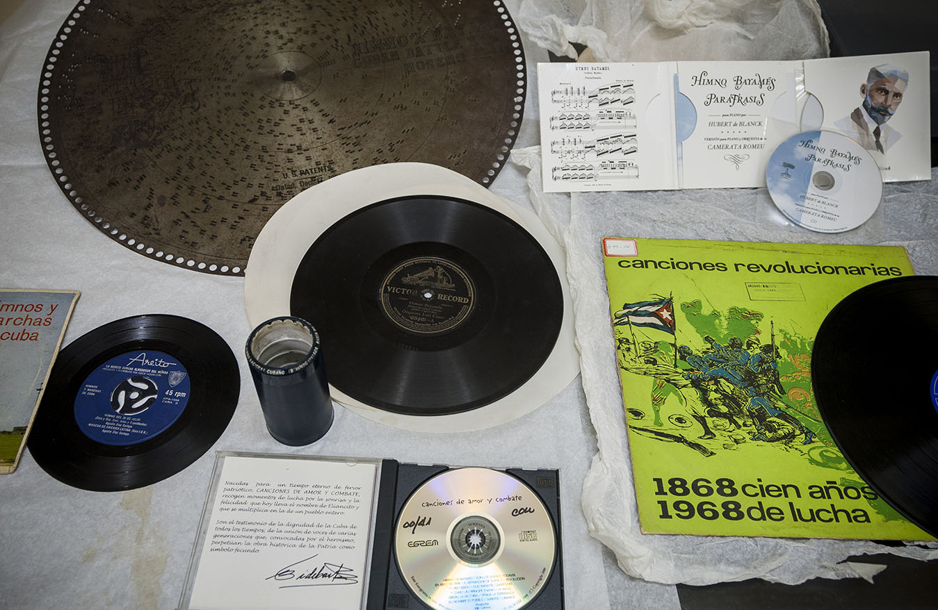 Un disco de latón del año 1899, un cilindro de baquelita con membrana de vaca, un disco de 78 revoluciones por minuto grabado en Estados Unidos por una orquesta cubana y un disco de 45 revoluciones por minuto son algunos de los soportes en los que ha sido grabado nuestro Himno Nacional.