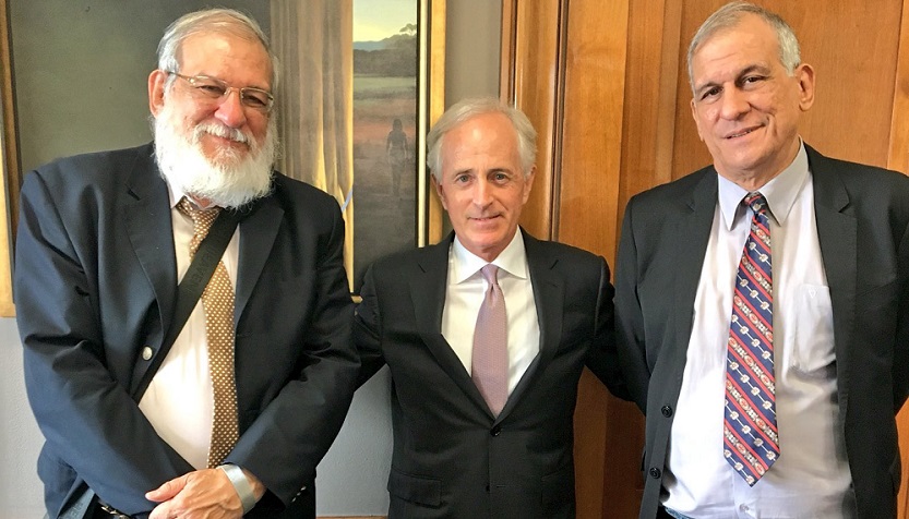El Senador Bob Corker, Presidente del Comité de Relaciones Exteriores del Senado (al centro), escuchó a los miembros del equipo científico cubano, que expresaron opiniones que cuestionan las especulaciones sobre el “daño cerebral” por “misteriosas” armas a los Diplomáticos estadounidenses en Cuba. Junto con el Senador, los científicos Pedro y Mitchell Valdés-Sosa. (Foto: Johana Tablada/ Twitter).