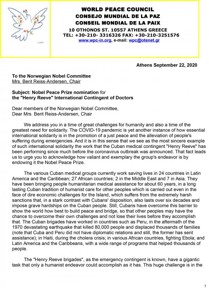 Mediante una carta enviada al Comité Nobel de Noruega, el Consejo Mundial por la Paz registró, formalmente, la candidatura del Contingente Internacional de Médicos Especializados en Situaciones de Desastre y Graves Epidemias Henry Reeve, de Cuba, al Premio Nobel de la Paz.