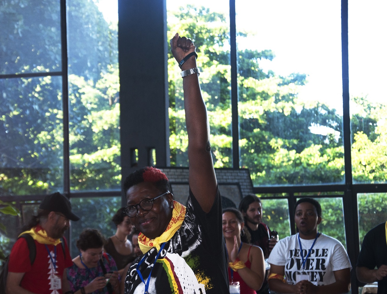 Suena un silbato y al instante están varias personas reunidas en un círculo que se conocen a través de las técnicas de educación popular. De momento, se escucha un grito de “¡Viva América Latina!” que es seguido por “¡Manos fuera de Cuba”” y “¡Lula Libre!”, aplauden, sonríen, agitan las banderas.