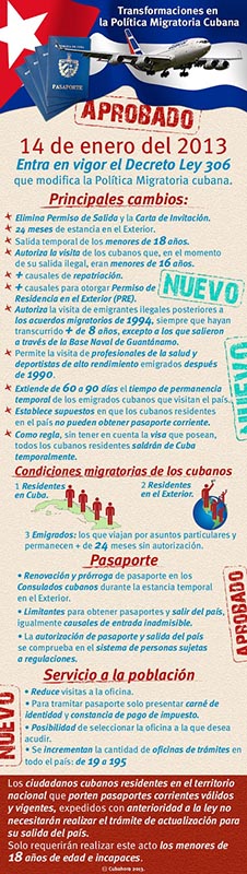En enero de 2013 Cuba, en ejercicio de su soberanía, anunció la actualización de su Política Migratoria ajustada a las condiciones de su presente y futuro previsible. En aquel momento el Gobierno cubano decidió eliminar el procedimiento de solicitud de Permiso de Salida para los viajes al exterior y dejar sin efecto el requisito de la Carta de Invitación, reclamos esenciales de la población cubana.