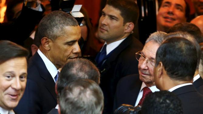 El presidente cubano Raúl Castro y Barack Obama, presidente de los Estados Unidos se saludan en la Cumbre de las Américas, junto al presidente de Panamá. (Foto: Reuter).