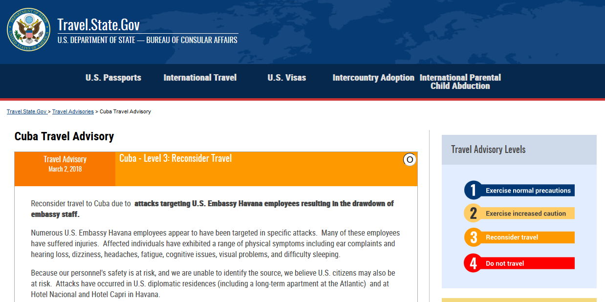 Cuba aparece en el Nivel 3 (Reconsiderar el viaje) dentro de las Recomendaciones de Viaje del Centro de Información para Viajeros del Departamento de Estado (Fuente: Sitio del Departamento de Estado de EE.UU.).