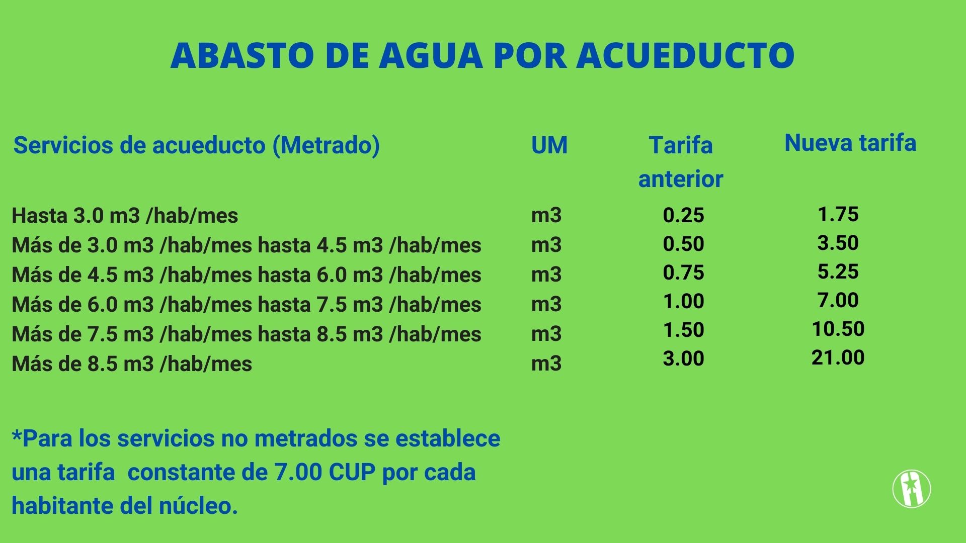 Como parte de la implementación de la Tarea Ordenamiento en Cuba, se modificaron las tarifas de los servicios de abasto de agua y el alcantarillado, los cuales son subsidiados. Los importes fueron aprobados por el acuerdo 8991/2021 del Consejo de Ministros que establece las tarifas máximas en pesos cubanos para el sector doméstico.