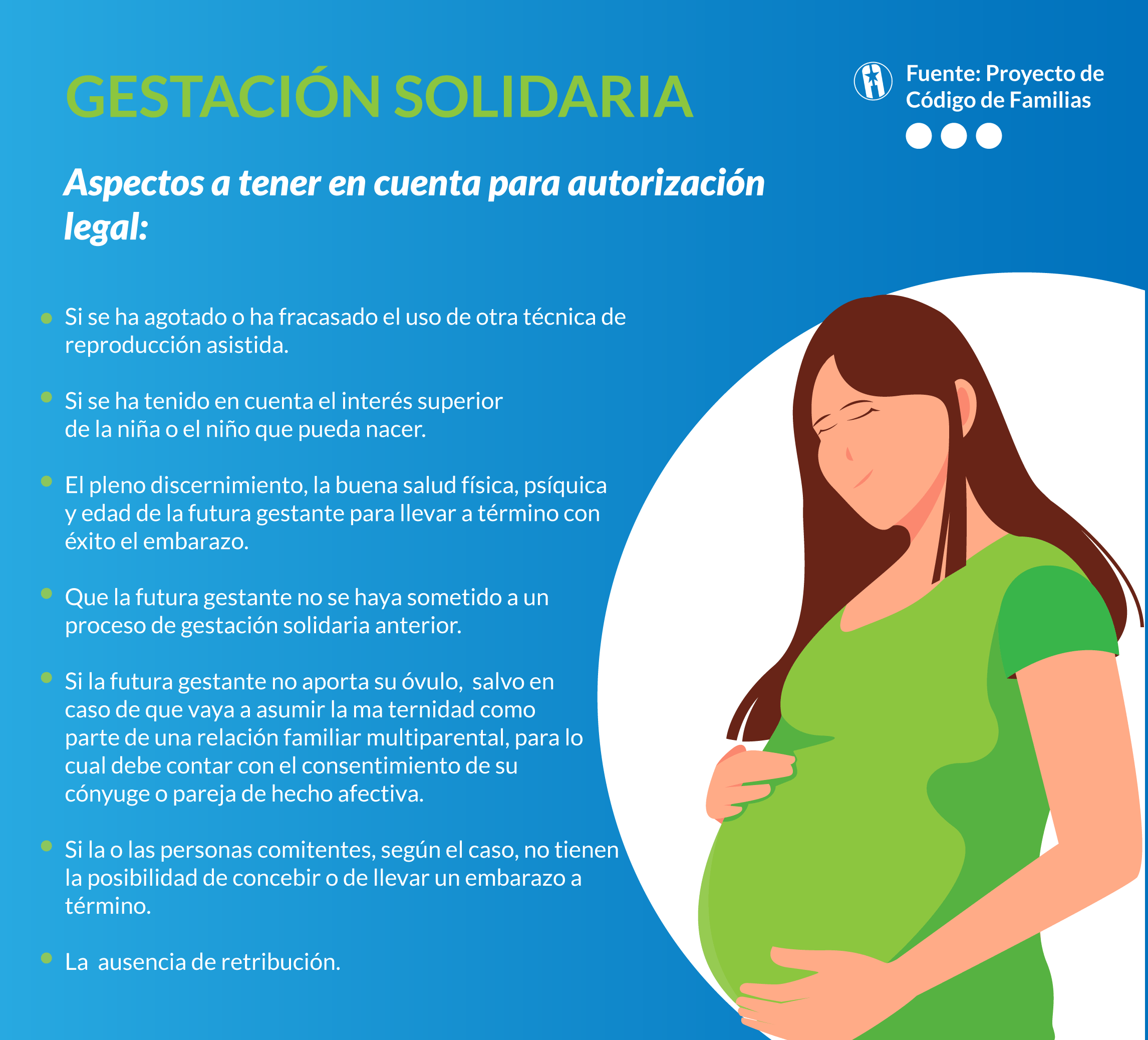 El Reglamento define la gestación solidaria como la transferencia de embriones mediante la realización de una técnica de reproducción asistida a una persona apta, con el fin de lograr la gestación y desarrollar el embarazo hasta el nacimiento.