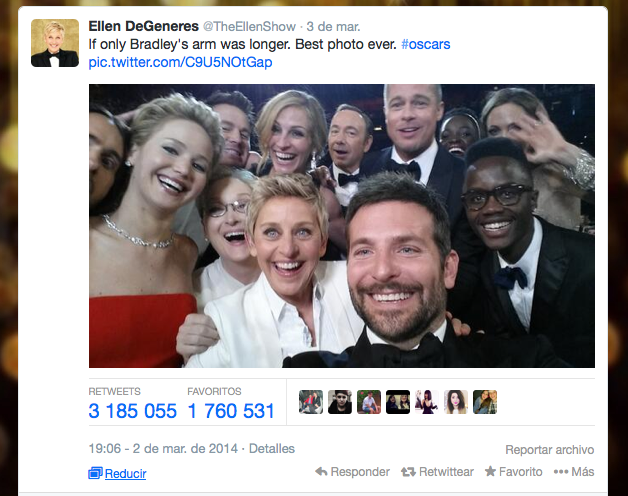 El mayor alcance de la etiqueta #selfie fue durante la entrega de los Premios Óscar en 2014, cuando la presentadora de televisión estadounidense Ellen DeGeneres se tomó una fotografía de este estilo con los famosos presentes y la posteó en su cuenta de Twitter. Esa imagen se convirtió en su momento en el tuit más compartido de la historia, con 1,7 millones de retuits en una hora.