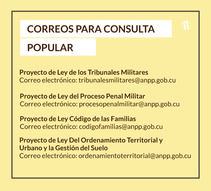 Se trata de los proyectos de leyes “de los Tribunales Militares”, del “Proceso Penal Militar”, el “Código de las Familias” y “Del Ordenamiento Territorial y Urbano y la Gestión del Suelo”. Todos estos están disponibles para la consulta de la población y abiertos a recibir opiniones. Al respecto, Cubahora detalla las novedades de cada uno.