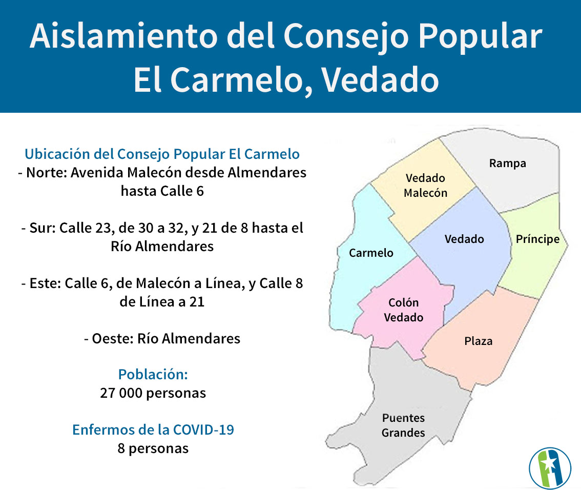 Entre las medidas se encuentra el cierre del acceso a él desde este viernes 3 de abril, a partir de las 8 de la noche. Este Consejo Popular es el de mayor número de contagiados por contactos con extranjeros y con cubanos que llegaron del exterior; en total son 8 casos en el Consejo que abarca de la calle 6 a calle 28 y de 21 a Malecón.