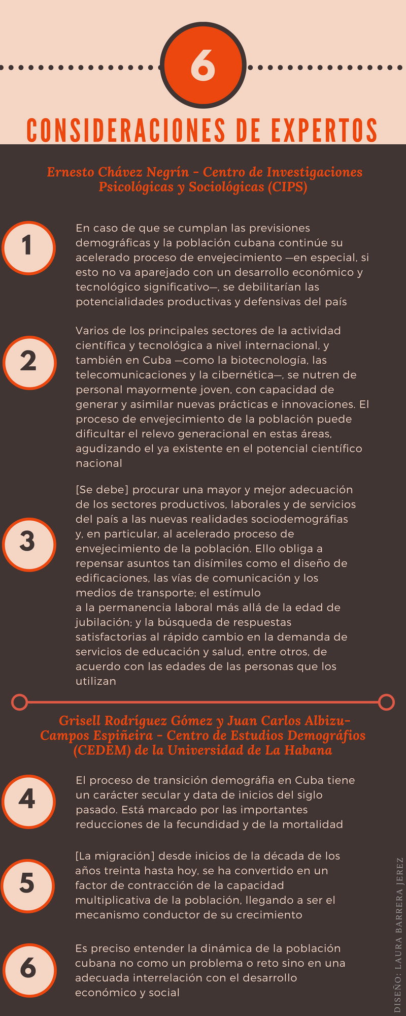 “El cambio de la población cubana no debe continuar siendo percibido como un problema o un reto, sino que debe abordarse en un marco de interacción con el desarrollo económico y social. Por lo tanto, nada de lo que suceda en términos de política de hoy es compatible con una visión fragmentada en lo que se refiere a los aspectos demográficos. Es factible que se diseñen o implementen acciones en este sentido, pero ellas deben ser manejadas desde la perspectiva de su impacto sistémico en la dinámica de la población”, aseguran Grisell Rodríguez Gómez y Juan Carlos Albizu-Campos Espiñeira, especialistas del Centro de Estudios Demográficos (CEDEM) de la Universidad de La Habana, en su artículo “La población de Cuba hoy” (publicado en 2015).