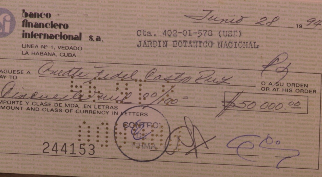 Fueron varios los cheques que emitió el Jardín Botánico; pero el 27 de febrero de 1997 Fidel canceló el último y escribió una nota: “se le asigna al Jardín Botánico”. Ya el país estaba en plena crisis económica y él prefirió que el Botánico dispusiera de ese dinero para enfrentar las complejas circunstancias que se vivían y las esperadas para los próximos años. De esa forma, se canceló uno de los canales en que se movía el dinero entre el Jardín Botánico y Fidel.