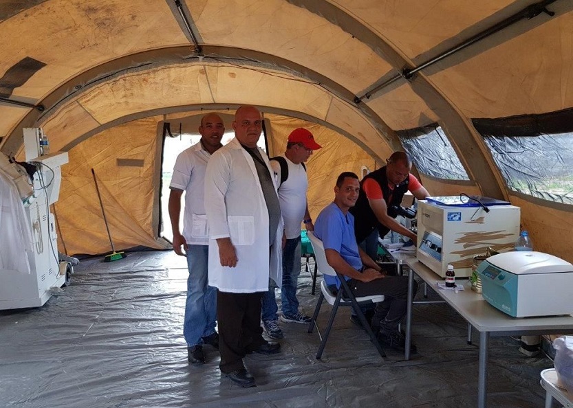En el Pabellón de deportes de Punta Gea, particularmente en su cancha de básquet, fue montado el hospital de campaña. Desde horas de la mañana siguiente al arribo comenzaron los trabajos. Fueron dispuestas las zonas de triache, consulta médica, sala de preoperatorio, salón de operaciones, farmacia, laboratorio clínico y hospitalización.